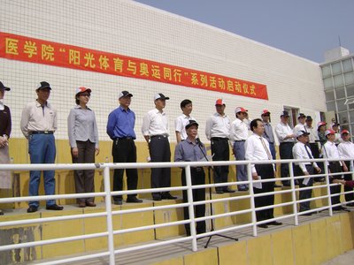 5月1日上午,我校“阳光体育与奥运同行”系列活动启动仪式在田径场隆重举行,出席本次活动的有校党政领导、职能部门和各系部负责人,仪式由副院长李朝品同志主持。在启动仪式上,党委副书记、院长宋建国同志作了热情洋溢的讲话。校党委书记卞国忠同志宣布我校“阳光体育与奥运同行”系列活动正式启动。随后,由宋建国院长发令,举行了“迎奥运”校园健身跑。