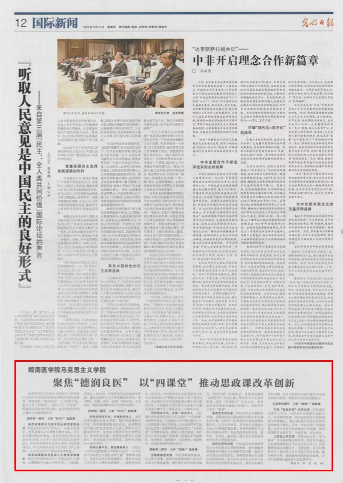 【编者按】为全面落实立德树人根本任务,深入推进新一轮本科教育教学审核评估工作,学校坚持以习近平新时代中国特色社会主义思想为指导,以评促建、以评促改、以评促管、以评促强,持续深化本科教育教学综合改革,不断提升人才培养质量。为充分展示各学院在本科人才培养和教育教学改革中的举措与成效、特色与优势,宣传部联合各二级学院推出“本科教育教学审核评估学院巡礼”系列报道,旨在总结成绩、凝聚共识、汇聚力量,激励广大师生为全面推进学校高质量发展、建设高水平医科大学不懈奋斗,努力答好“教育强国,皖医何为”的时代答卷。本期巡礼学院:马克思主义学院。
