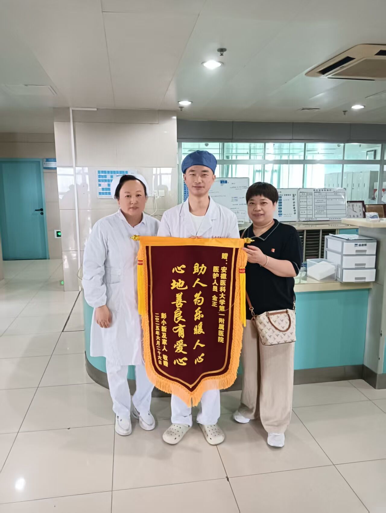 4月18日中午,金正同学在前往安徽医科大学第一附属医院(绩溪路)实习途中,于九华山路桥底发现一位中年女子跌倒受伤坐在电瓶车旁。凭借所学专业知识与实习中训练的应急能力,金正当即上前查看,询问事发经过,判断女子伤情,安慰伤者,并陪同去急诊就医。经医院及时治疗,伤者得到了妥善处理,身体无大碍,预计不久便能重返工作岗位。为表达对金正同学关键时刻施以援手的感激,伤者特地将一面锦旗送到医院。在接到锦旗的那一刻,金正同学谦逊地表示:“能帮到阿姨,我自己也感到非常欣慰,但这并非我个人的功劳。那一刻的应急反应和处置,完全是学校老师们的谆谆教导和医院带教老师们言传身教的结果。这面锦旗,更应该属于培养我的学校和医院,属于所有教导过我的老师们。”