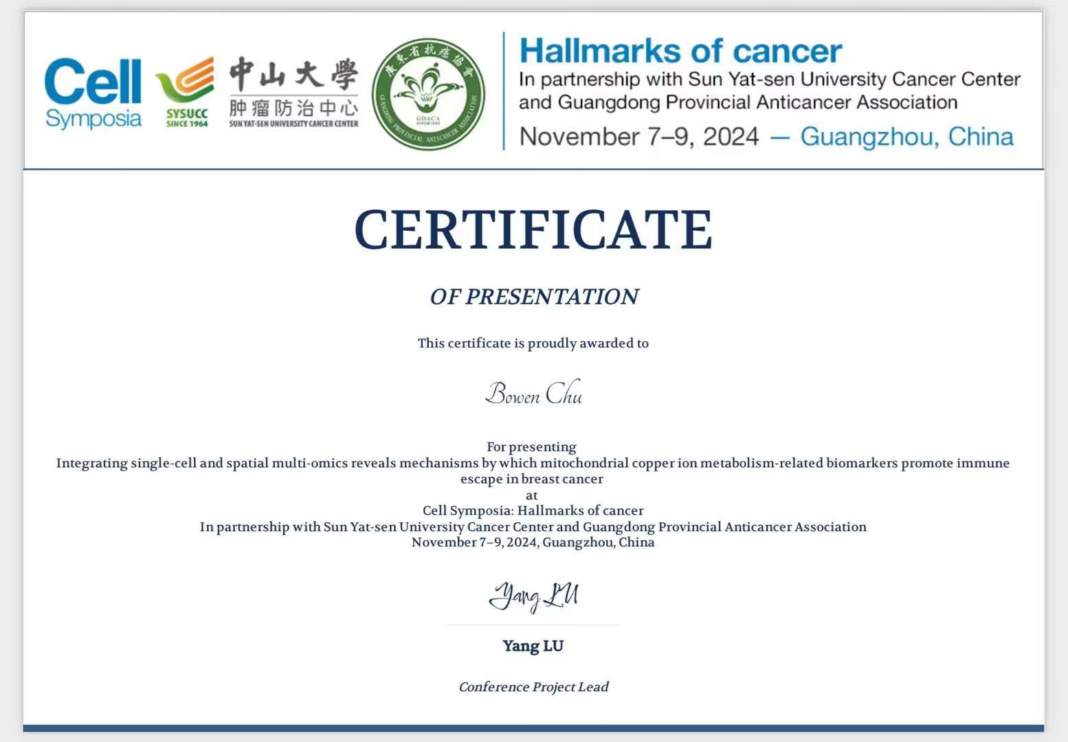 储博文思维活跃、内驱力强,始终立足解决临床问题。他作为第一作者,与导师及弋矶山医院科研团队合作完成的成果《Integrating single-cell and spatial muti-omics reveals mechanisms by which mitochondrial copper ion metabolism-related biomarkers promote immune escape in breast cancer》,在顶级期刊Cell创刊50周年大会上被授予壁报荣誉奖,获得包括Tak Wah Mak、Joseph Costello在内的国际顶级学者认可。此外,储博文主动组建研究团队,独立申报并获批国家级大学生创新创业训练计划项目1项,相关成果发表于British Journal of Pharmacology。他主持运行的两项多中心临床队列研究,经两年努力成功构建了全球首个涵盖体质-血液-疾病的多组学前瞻队列,相关进展受到JAMA Network和Nature Medicine关注,团队亦于2024年创建升明医药(南京)公司,专注于医学诊断模型与基于深度学习的药物开发。