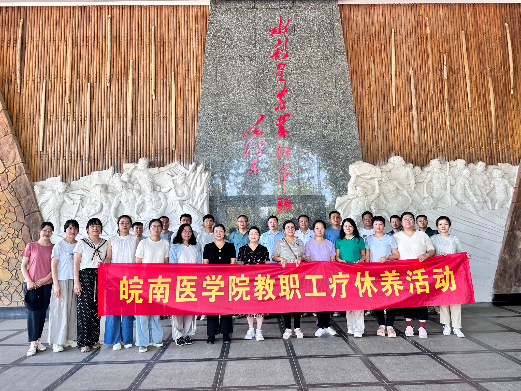 活动中,教职工们走进许继慎纪念馆、苏家埠战役陈列馆,革命先辈许继慎将军的英勇事迹与崇高精神、苏家埠战役的激烈鏖战,通过详实的史料鲜活地呈现在大家眼前。馆内陈列的珍贵文物、历史照片以及生动的文字介绍,仿佛将大家带回到那段波澜壮阔的革命岁月,红色印记与历史回响直击心灵。教职工们还相继探访了横排头水利枢纽、龙河口水库纪念馆及佛子岭水库。这些水利工程不仅是人类改造自然的智慧结晶,更镌刻着艰苦奋斗、无私奉献的精神密码。横排头水利枢纽气势恢宏,在防洪、灌溉、航运等方面发挥重要作用。“人间天河”淠史杭、龙河口水库纪念馆内,通过各种展示手段,生动地展现了当年建设者们肩挑背扛、不畏艰难建设水库的场景。佛子岭水库作为新中国成立初期自行设计、施工的大型水利工程,其建设过程中的艰辛与不易,让每一位教职工都深受触动。