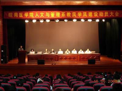 5月15日晚,人文与管理系在大学生活动中心召开迎评促建教风学风建设再动员大会,会议由系党总支副书记、系副主任刘华主持,学校党委副书记、纪委书记程度同志、学生处处长钱何珍同志以及人文与管理系全体师生出席了大会。 首先,在刘华同志的倡议下,大家为在“5.12汶川大地震”中遇难的同胞默哀三分钟,随后系主任胡鸿同志从理论上阐述了教风与学风的辩证关系,强调教师要加强教风建设,尤其是在评建的关键时刻发扬拼搏精神,充分展示人文与管理系教师的精神风貌。刘华同志就学风建设的现状做了认真的分析,并就学风建设的任务进行了部署。刘新民教授和高玉玲副教授代表全系教师做了表态性的发言。陈帅和窦蕾同学作为学生代表在会上也郑重承诺,要保持良好的精神状态和风貌迎接教育部专家组的评估。系党总支书记方继经同志作了题为“凝心聚力,全力以赴,人人争当得分手”的讲话,要求全体师生凝心聚力迎评建,人人勇挑评建重担,人人肩上有指标,人人都是得分手。钱何珍处长指出了教学评估的重要性,强调学生是教学评估的最终受益者,并结合评估指标体系对同学们如何创建优良学风作了具体的指导。程度同志在揭示我校深厚的文化底蕴和评建所取得成绩的基础上,做了“坚定信心、正视困难、迎接挑战”的重要讲话,并要求大家继续发扬我校艰苦奋斗、奋发向上的优良传统,秉承“校荣我荣,校衰我耻”的思想,齐心协力迎接教育部对我校的本科教学工作水平评估。程度同志的讲话在学生中引起了极大的共鸣,几次被同学们的掌声打断。会议进行了2个小时,在同学们热烈的掌声中圆满结束。通过大会,学生们对教学评估、教风建设和学风建设的意义有了更正确、更深刻的认识,在行动上将会从小事开始,从自身做起,营造优良学风,展现皖医学生的良好精神面貌。 最后刘华同志号召大家为灾区献出一片爱心,同心协力、众志成城,帮助灾区人民共同度过难关。人文与管理系团总支学生会开展了向汶川大地震灾区的募捐活动。(人文与管理系 胡鸿/文 王筱萌/摄 宣传部 凤焱/审 )