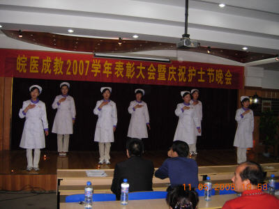 成教院老师为全体获奖学生颁发了荣誉证书和奖品。颁奖结束,庆祝护士节晚会在热烈的掌声中开始。手语舞蹈《感恩》表达了护理专科班同学的心声;《三句半》幽默逗趣,称赞我们的校园如同公园一般的美丽漂亮,称赞我们的教师辛勤耕耘的奉献精神;精彩纷呈的节目引起了同学们阵阵欢乐的笑声。