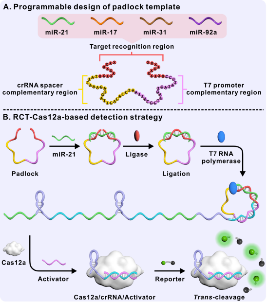 本研究创新性地利用成簇规律间隔短回文重复序列(CRISPR)及其相关蛋白(Cas)的特异性酶活性,开发了一种通用、可编程的miRNA检测策略。该策略结合了可编程滚环转录技术(RCT)和高反式切割活性的CRISPR/Cas12a系统,成功实现了对4种结直肠癌相关miRNA浓度的高灵敏度、高特异性分析。研究结果表明,该检测系统在区分人类正常结肠上皮细胞系和结肠癌细胞方面表现出显著优势。这种整合了CRISPR系统和RCT信号扩增技术的miRNA浓度检测方法,不仅具有可编程性、可扩展性和高灵敏性,更为解决肿瘤相关多种miRNA分析的复杂性提供了新的视角。(任丹丹/文、图)